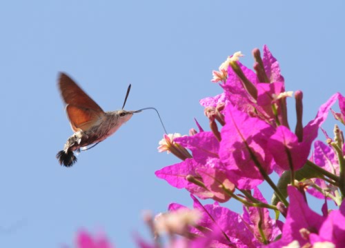Hummingbird Hawkmoth - it may be this name that has confused bird-life photograper Colin Turvey into photographing an insect (moth) in flight - collecting pollen from a bougainvillea. Whatever, this beautiful insect is worth it. The photo stunning.... |