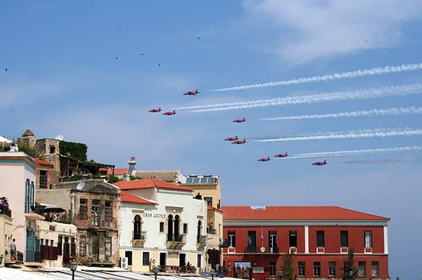 Visiting the Battle of Crete Memorial Ceremony at Chania . The top English RAF aerobatic display team, the Red Arrows, arrive over a crowded Venetian Harbour, led by Squadron Leader Ben Murphy, for what became, for the second year running, an absolutely stunning display of 'This is how it should be done' low flying aerobatics . |
