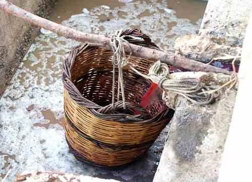 The traditional wine filter, grape juice - the must - pours from the treading into the catchment area of the 'Patitiri' - sieved through a very traditional wicker basket. No yeast is added at any stage, there being enough on the skins to do the job.... |