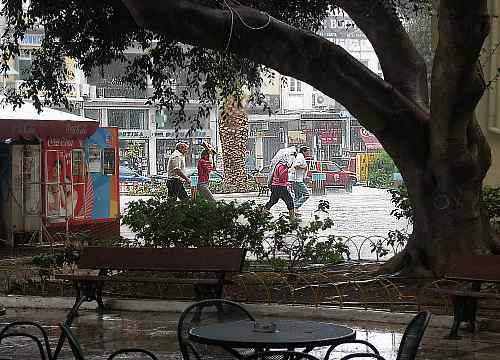 The tour bus had just dropped these tourists - it was warm with no rain - seconds later the heavens opened catching all in the open.