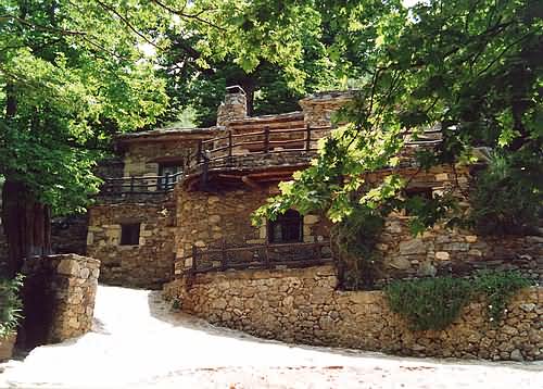 This house with it's rustic railings and intricate stonework stands shaded majestically beneath surrounding trees.