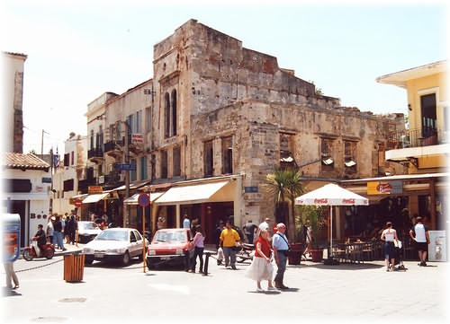 The junction of Halidon; Zambeliou; and Kanevaro and the Venetian harbour. The old Venetian buildings on the corner now house tourist shops.