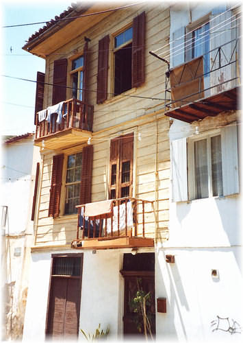 An excellent and typical example of a Turkish dwelling with the upper floors of wooden construction, including the balconies, and latticed doors and shutters.