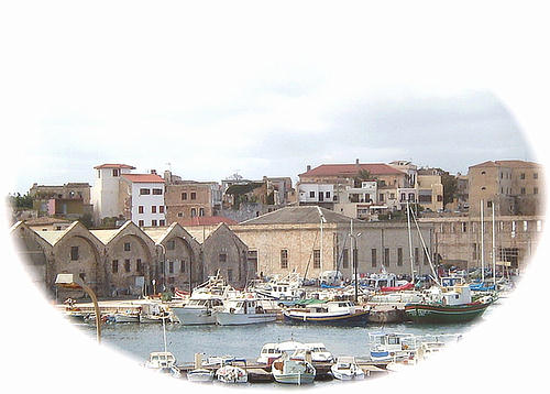 | The eastern end of the Venetian Harbour in Chania has become a summer Mecca for yachts which tie up along with local trawlers; small fishing boats; customs launches - sometimes even arrested vessels. In the left background the Venetian Armoury stands watching, the Customs House to its right. |