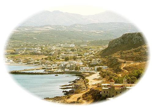 Kolimbari. Seen from the Elridon Monument - set above and to the west of the Monastery Gonias. Above the coast road running to Afrata and the Rodopos peninsulla. The photograph is typical of the view, although much of the small inlet in the picture is now occupied by a new harbour completed in 2002. |