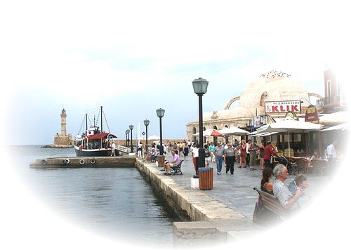 | The Venetian Harbour at Chania. This really should have been the photograph for June, but the cloudy sky kept back the sunshine - making it more like January. The Motor Vessel Irini sits at the quayside - a genuinely very old boat which will take you on that romantic sunset cruise out into the bay of Chania. |