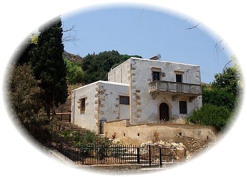 | A priests dwelling opposites the entrance to the monastery Gonias in Kolimbari shows a typically Cretan design with it's flat roofs and angled cornices. The large interlocking corner stones, door arches and window openings left exposed. Above the roadside - water flows downwards! |
