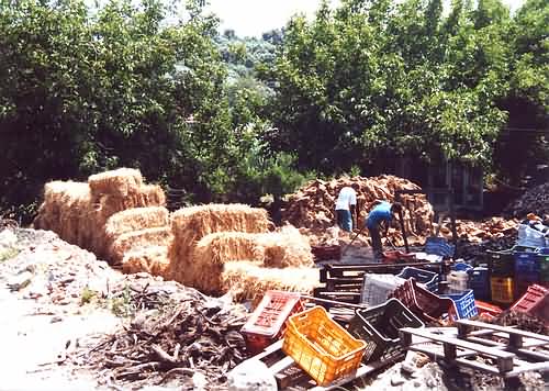 | The stack is covered with straw and capped with dirt to exclude the air - leaving only the central chimney open for lighting the stack. The straw/dirt forms a neat cap which tends not to fall into the spaces between the burning wood inside. |