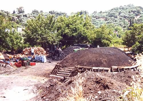 | This picture almost says it all. Soil/straw remains from a previous burn stands in front of a burning mound, for re-use, whilst to the centre rear a completed stack of charcoal standing next to the newly rising mound of new wood. |