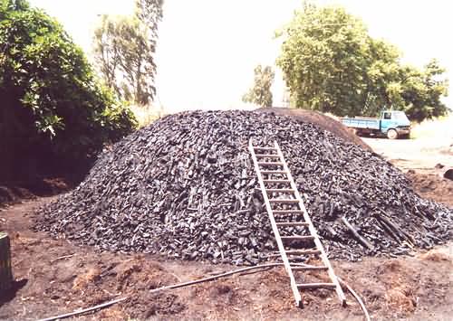 Beneath the cover. Remains of the earth/straw cover removed - the original wood stack is now beautifully finished charcoal - ready to be used as a fuel much lighter but more efficient than the original wood.