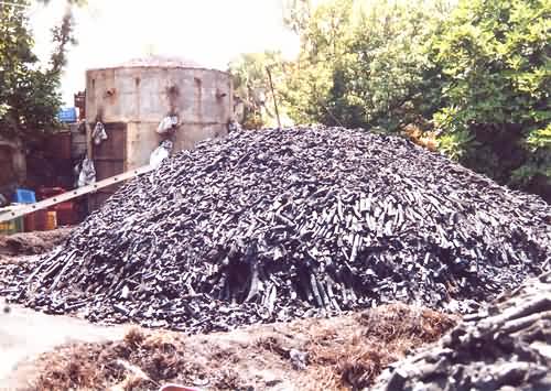 | A surprise find along a riverside track near Voukolies, Nomos Chanion. Charcoal burning pits! Wrong film in the camera, wrong light and a terrific heat haze - but an opportunity too good to miss - making charcoal in real life! |