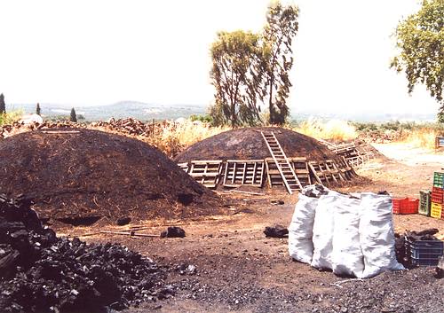 | Crop rotation! Furthest stack reaching maximum burn; to the left a finished stack waiting to be opened and in the left bottom corner the edge of a charcoal stack from a completed burn is ready for grading (sieving) and bagging. |