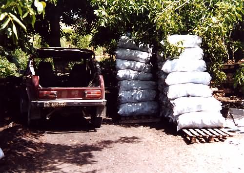 | Finished 27 kilo sacks being stacked on pallets ready for transport to retail outlets and commercial users such as tavernas. Available almost everywhere that sells food - including animal feed suppliers. Small quantities are no problem! |