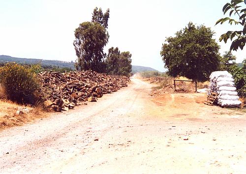 | New wood for charcoaling awaits conversion. Completed sacks await transport. Driving the water and assorted chemicals out of the air-dried wood by burning in the clamps - away from oxygen - produces the very clean and efficient charcoal. |